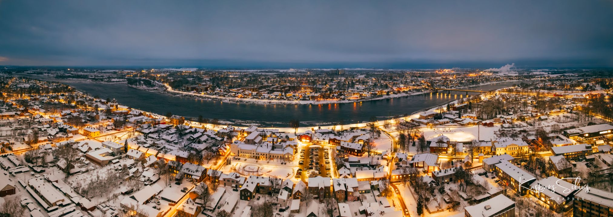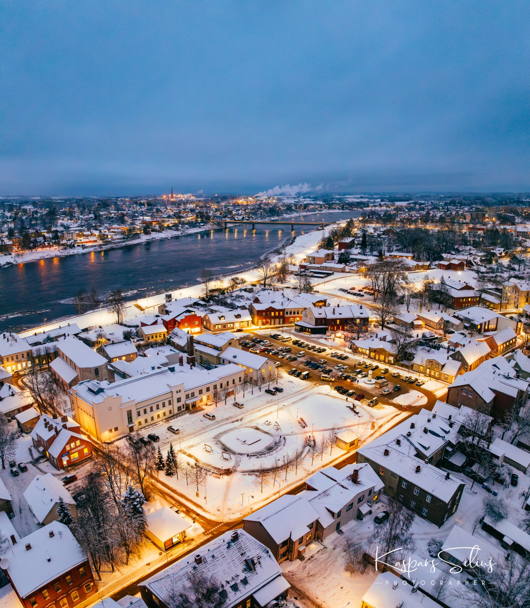 Balts sniegs un dzeltenie gaismu toņi izceļas uz tumšās pilsētas ainavas, rada sajūtu, it kā pilsēta gulētu klusumā un noslēpumā. Nav krāsu ir, tikai aukstums un pilsētas dzīve darba dienas vakarā. #ZiemaPilsētā #DronaSkati #NaktsAinavas